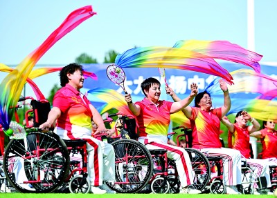 在宁夏银川,群众在全民健身主题活动上参加残疾人柔力球展演。新华社发